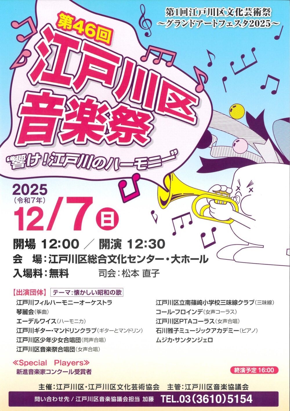 音楽協議会の加盟団体や小中学校の団体が一堂に会する区内最大の音楽イベントです。オーケストラ、合唱、ハーモニカ、琴、三味線、マンドリン、吹奏楽など多彩なアンサンブルをお楽しみください。 響け!江戸川のハーモニー♪
