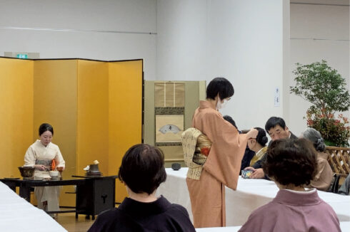 華道展では、各流派がそれぞれの個性を大切に、彩り豊かに秋の花材を活け上げます。お茶席では、お抹茶と和菓子を召し上がり、日本文化の深さをお楽しみいただきます。